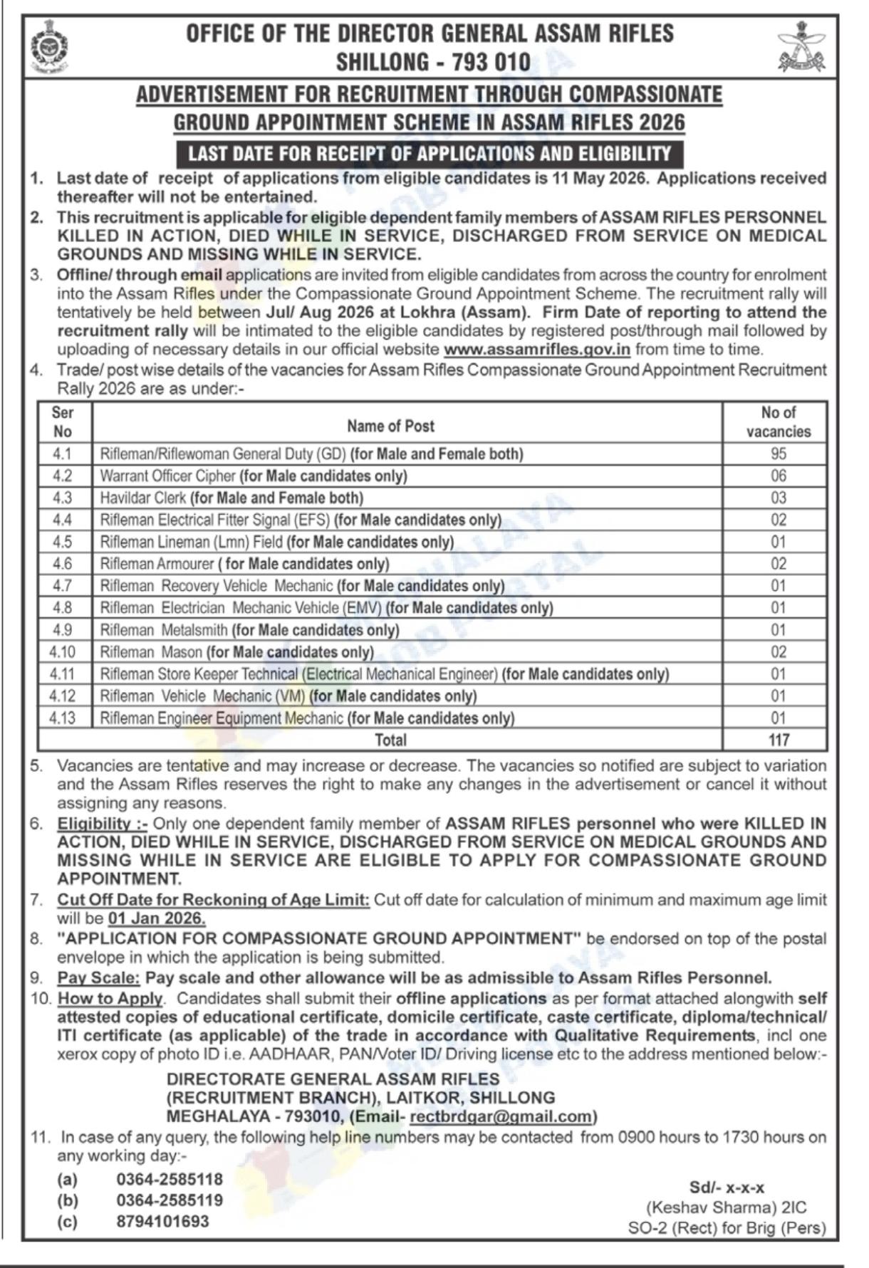 Only eligible family members of Assam Rifles staff can apply.