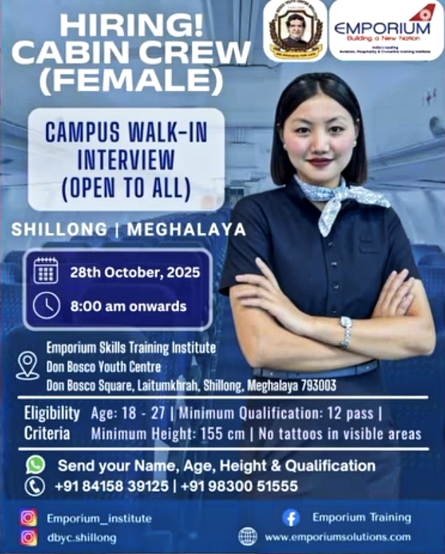 The Emporium Skills Training Institute is organizing a walk-in interview for cabin crew positions in Shillong, Meghalaya. The interview is open to all eligible female candidates who wish to be part of a well-known airline team.