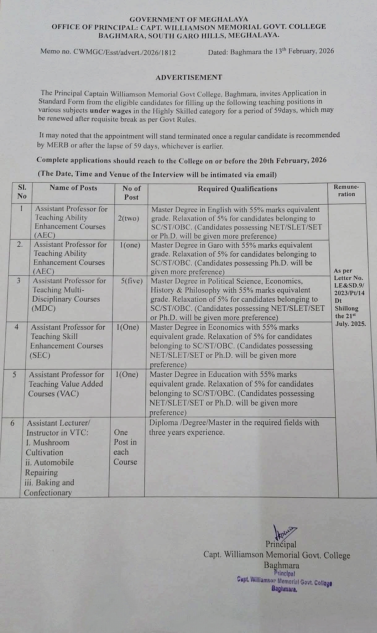The Capt. Williamson Memorial Govt. College has released an official notice for temporary teaching posts. The college is located in Baghmara, South Garo Hills, under the Government of Meghalaya.