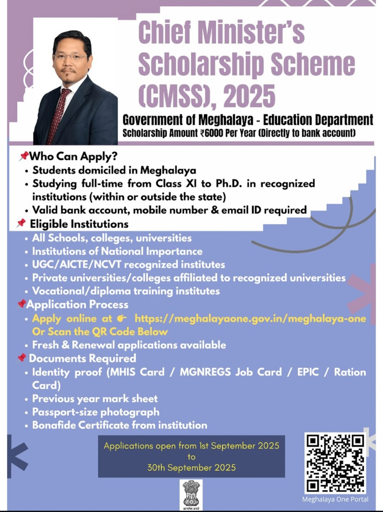 The Chief Minister of Meghalaya has shared good news for all students. He started the CM Scholarship Scheme Meghalaya 2025 to help students continue their studies without worrying about money. The scholarship started on 1 September, and you must apply before 31st October 2025.