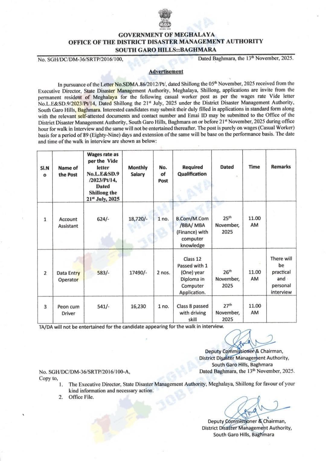 Many young people in South Garo Hills look for small work that can support their family. So, this notice from the District Disaster Management Authority (DDMA) brings hope. It shares job openings for a short period, and anyone who fits the rules can apply. The process is simple, and the walk-in interview dates are already fixed.