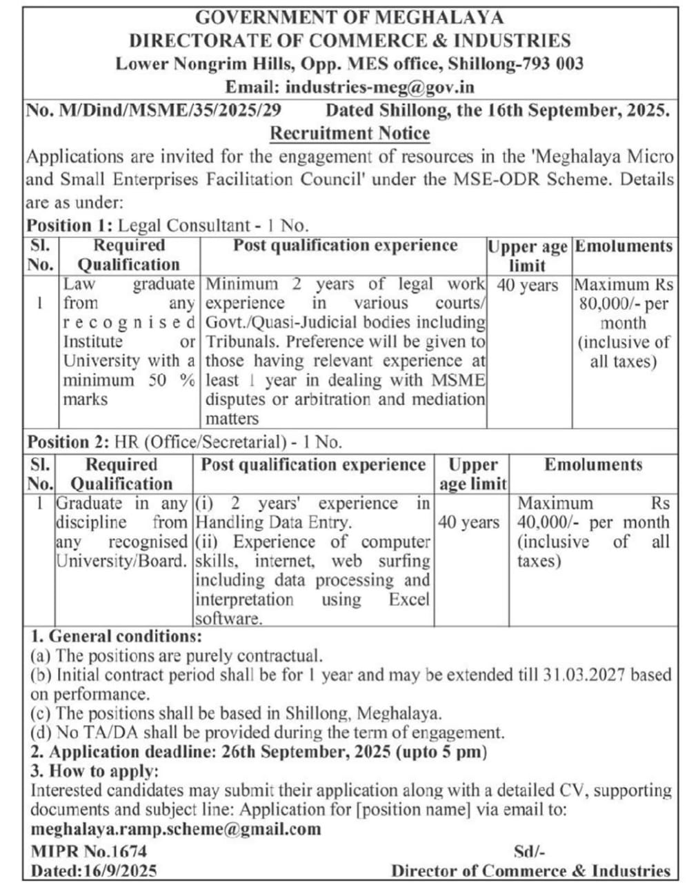 The Government of Meghalaya, Directorate of Commerce & Industries, Lower Nongrim Hills, Shillong, has shared a new recruitment notice. They are looking for skilled people to join the Meghalaya Micro and Small Enterprises Facilitation Council under the MSE-ODR Scheme. These jobs are on a contract basis but can be extended if you do well. Read below for the full details.