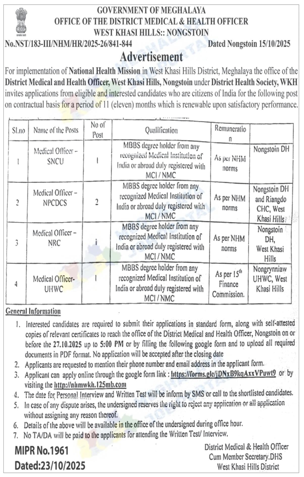 Candidates must submit their applications in the standard form along with self-attested copies of their certificates. The applications must reach the Office of the District Medical and Health Officer, Nongstoin, on or before 27th October 2025 (up to 5:00 PM).