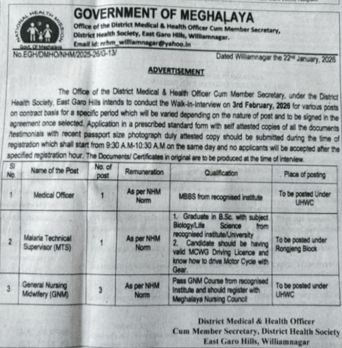 DMHO Williamnagar Recruitment 2026: The Government of Meghalaya has shared a fresh job notice for East Garo Hills. The District Medical and Health Officer, Williamnagar, plans to hold a walk in interview. These jobs are on contract under the District Health Society.