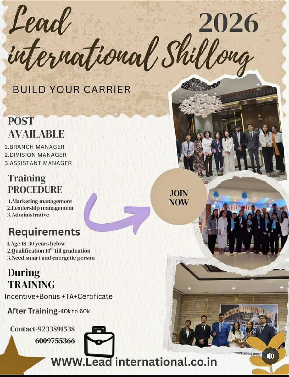 Lead International Shillong 2026 is a job and training program offering management roles in Shillong.