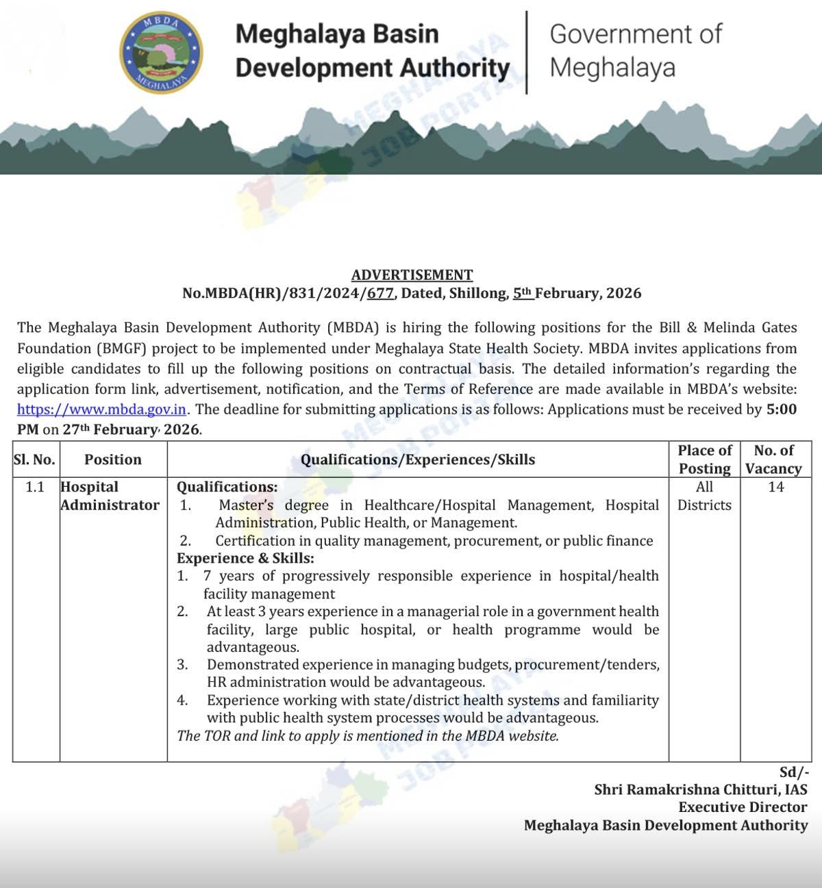 MBDA Meghalaya Recruitment 2026 brings a fresh chance for those who wish to work in public health and serve the people of Meghalaya. The Meghalaya Basin Development Authority has shared a new notice for Hospital Administrator posts. This hiring is for a health project supported by the Bill & Melinda Gates Foundation and run under the Meghalaya State Health Society.