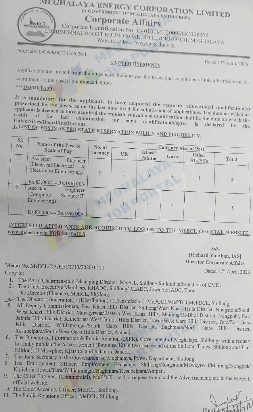 Meghalaya Energy Corporation Limited (MeECL) has shared a new job notice on 17 April 2026. This company works under the Government of Meghalaya. So, getting a job here is a big step for many candidates.