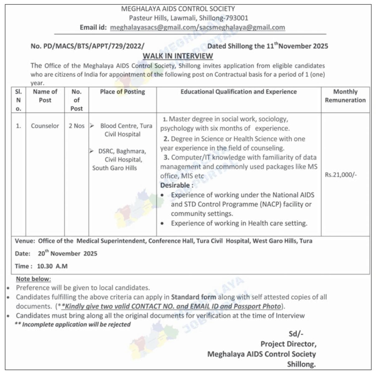 The Meghalaya AIDS Control Society, Shillong has released a new notice for the recruitment of Counselors on a contract basis for one year. This is a good chance for candidates who want to serve in the health sector and help people. The interview will be held soon, so interested candidates must prepare their documents and apply.