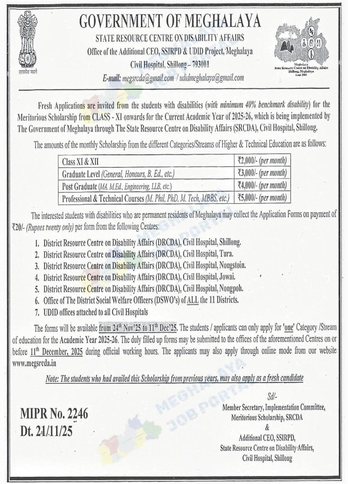 Students with disabilities often dream of studying well and building a bright future. To support these dreams, the Government of Meghalaya invites fresh applications for the MEGSRCDA Meritorious Scholarship 2025-26. This help is for students from Class XI and above who have 40% or more disability.