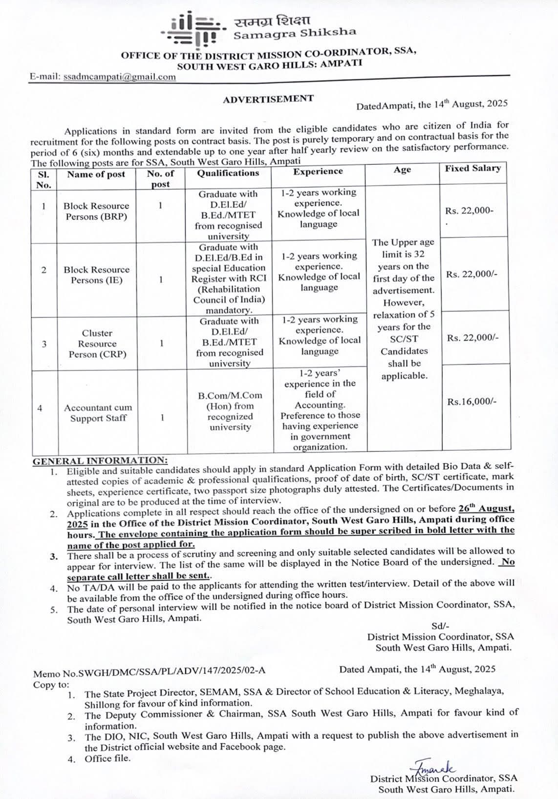 - Applications should reach the Office of the District Mission Coordinator, SSA, South West Garo Hills, Ampati on or before 26th August 2025 during office hours.