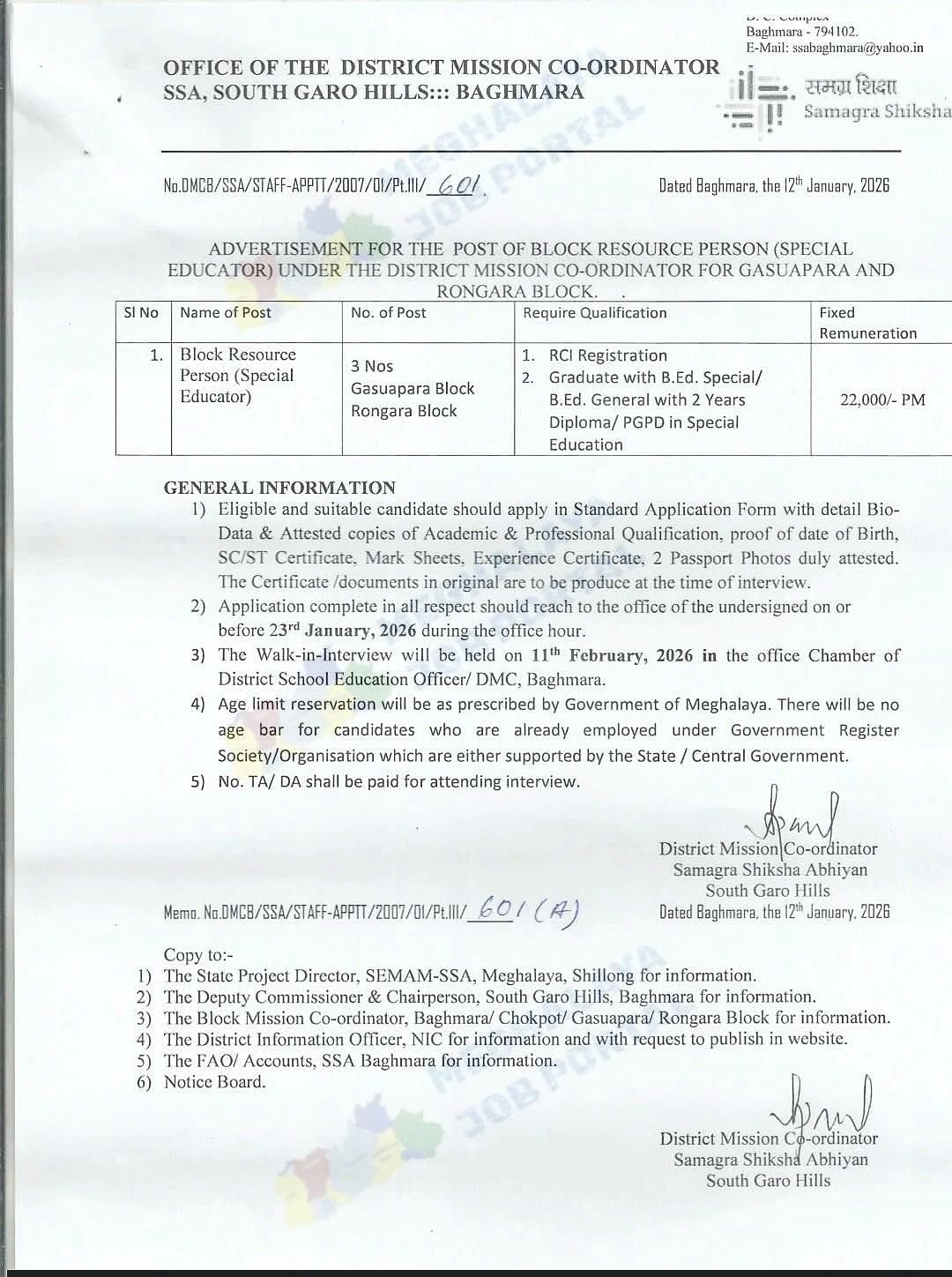 SSA South Garo Hills Recruitment 2026: The Office of the District Mission Co-ordinator, SSA South Garo Hills, Baghmara, has shared an official notice. This notice is under Samagra Shiksha.